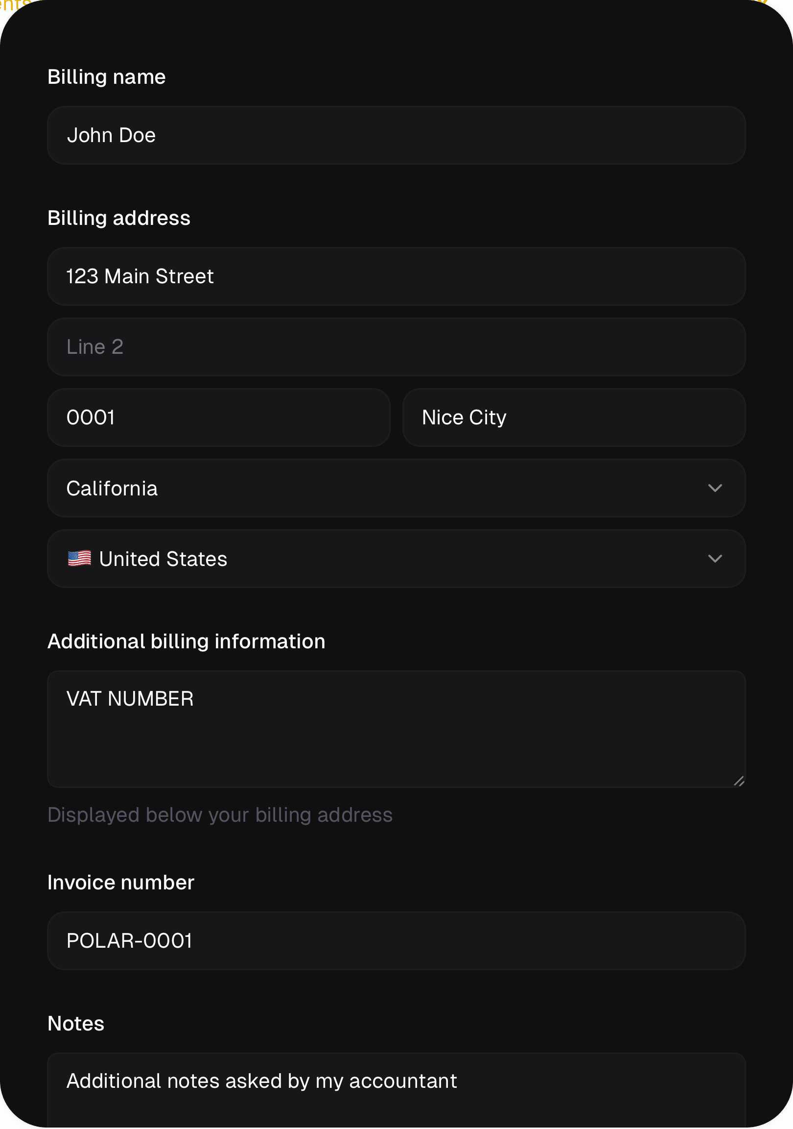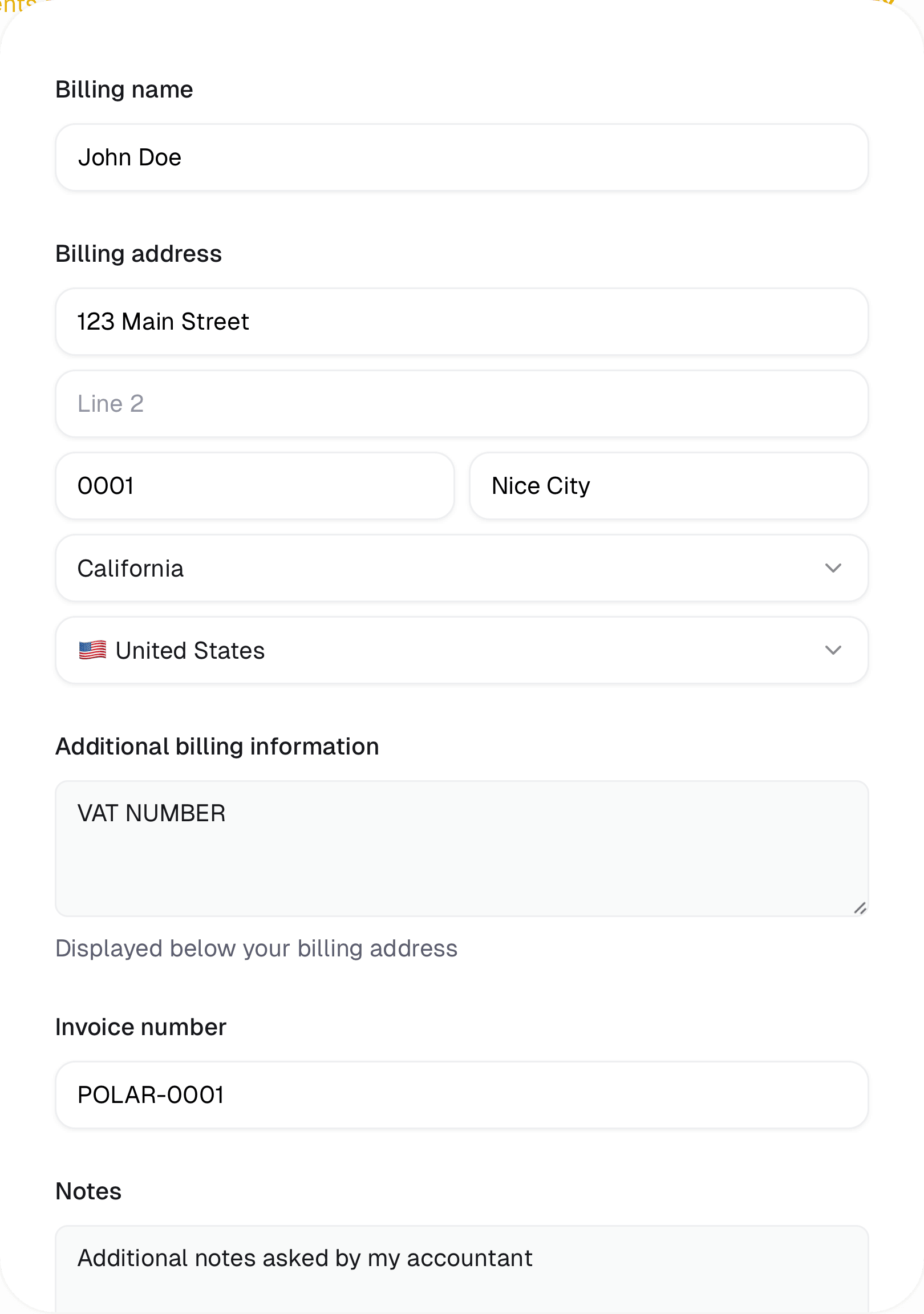 - Customize the invoice number. By default, we generate one like POLAR-0001, but you can change it to your own format and sequence.