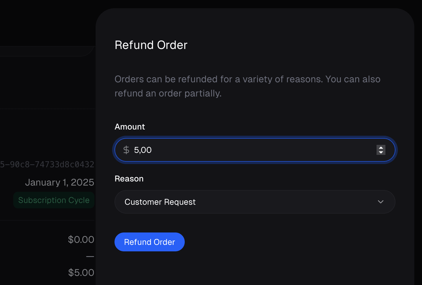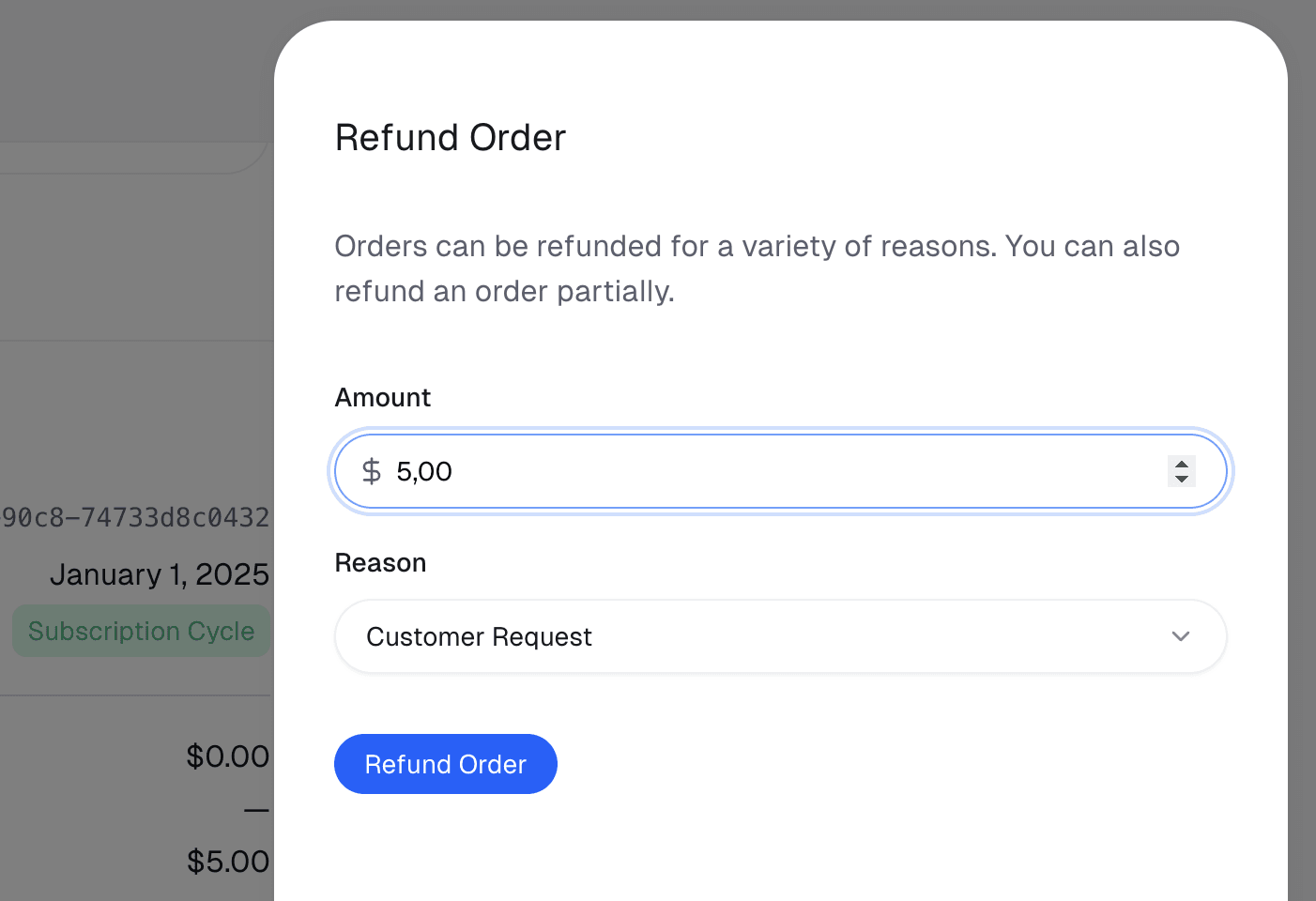 No matter what refund policy you offer to customers, Polar makes it easy to offer both full and partial refunds to easily deliver the customer experience and refund policy you want.