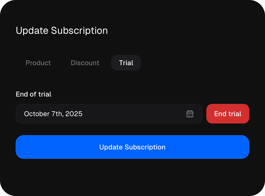 For existing subscriptions, youu can add, extend or cancel a customer’s trial period at any time through the dashboard, from the subscription details page. Click on Update Subscription, then click on the Trial tab.