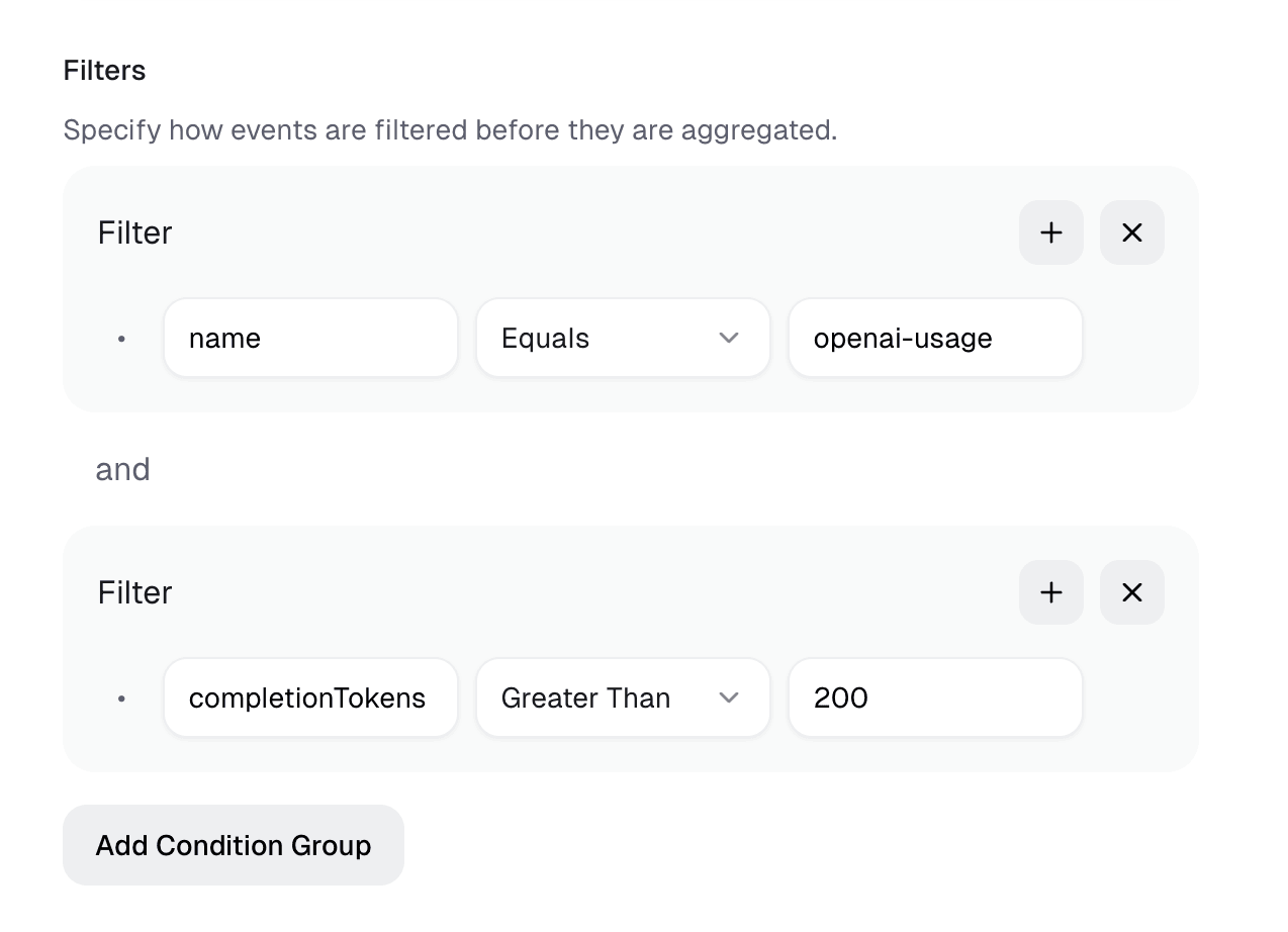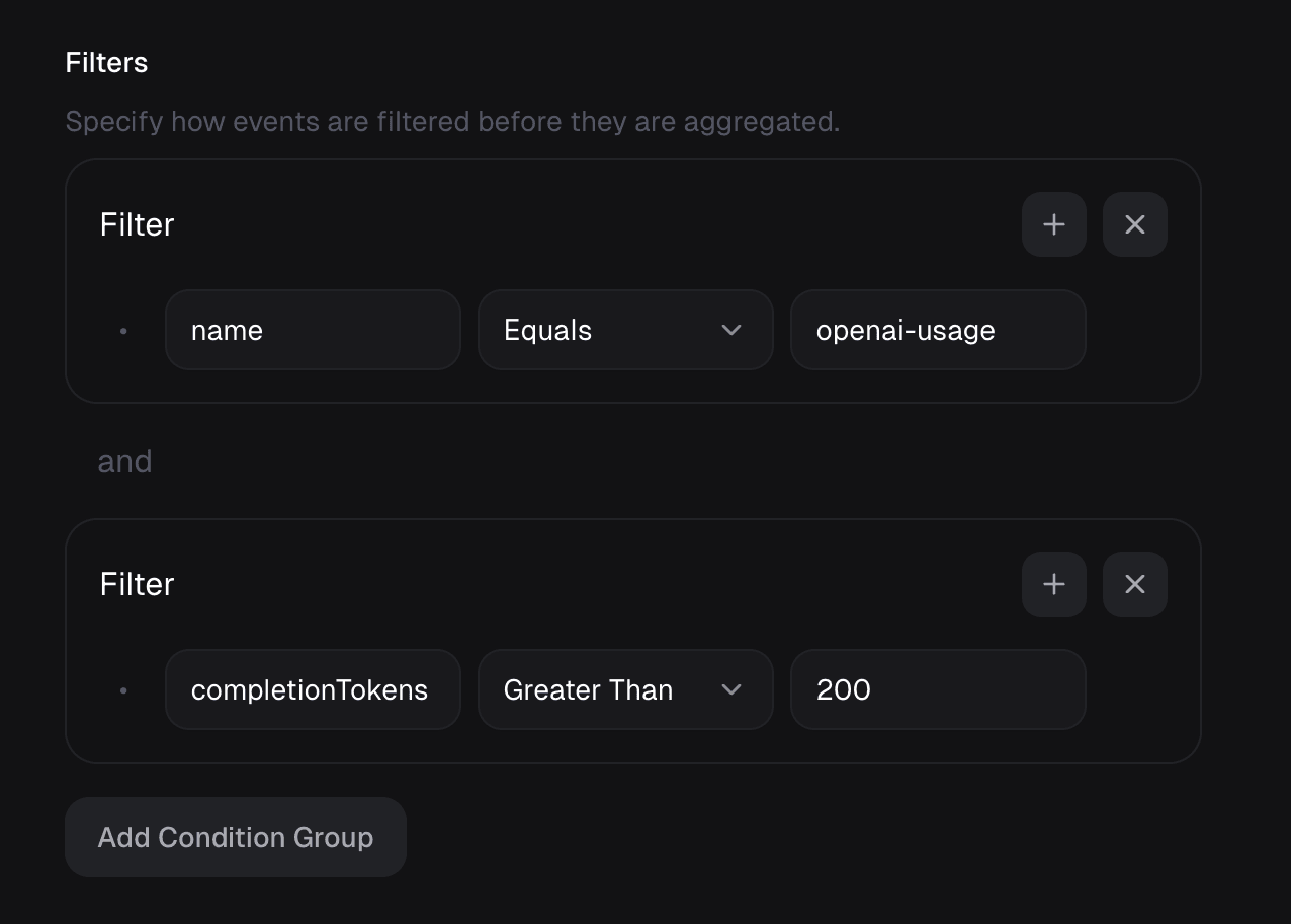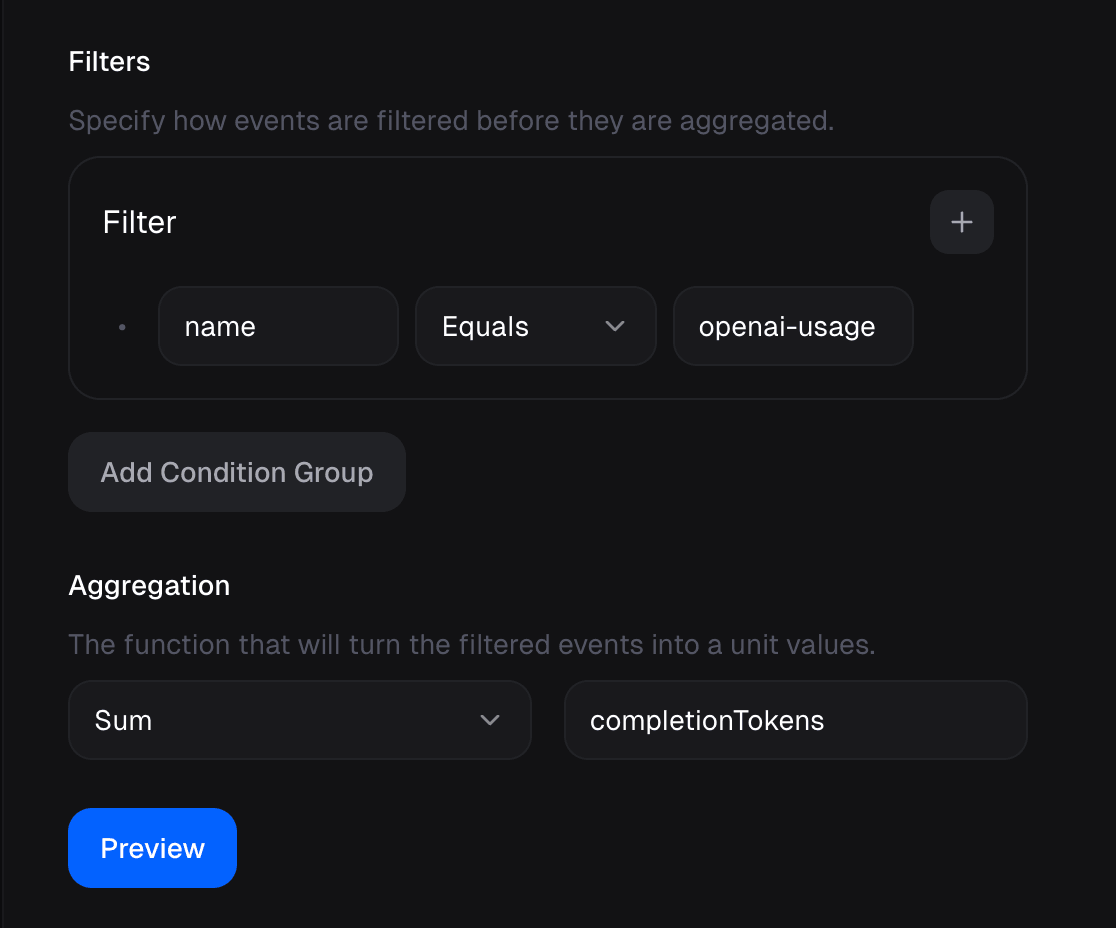 The following Meter Filter & Aggregation will match events that have the nameopenai-usage and sum units over metadata property completionTokens.