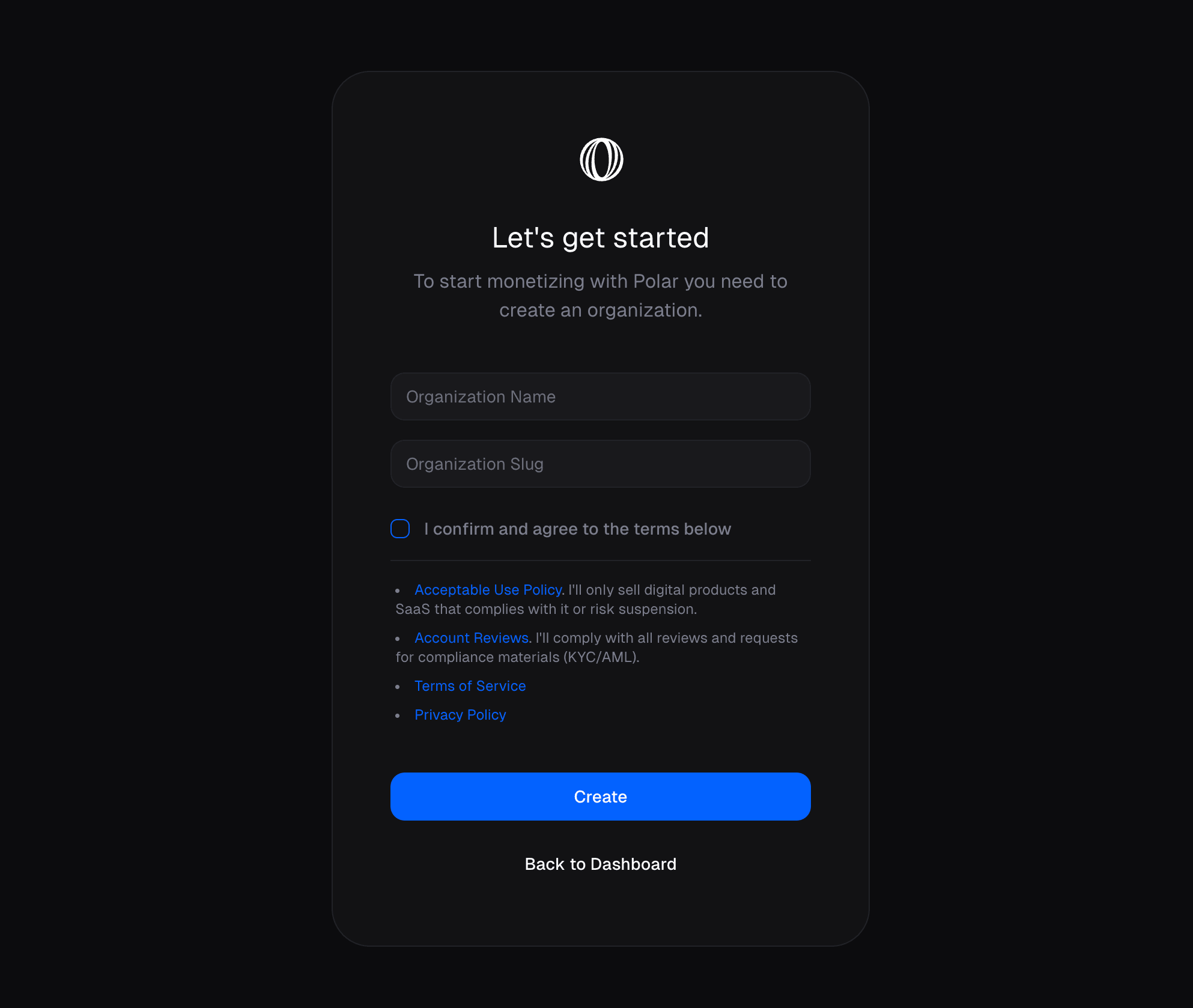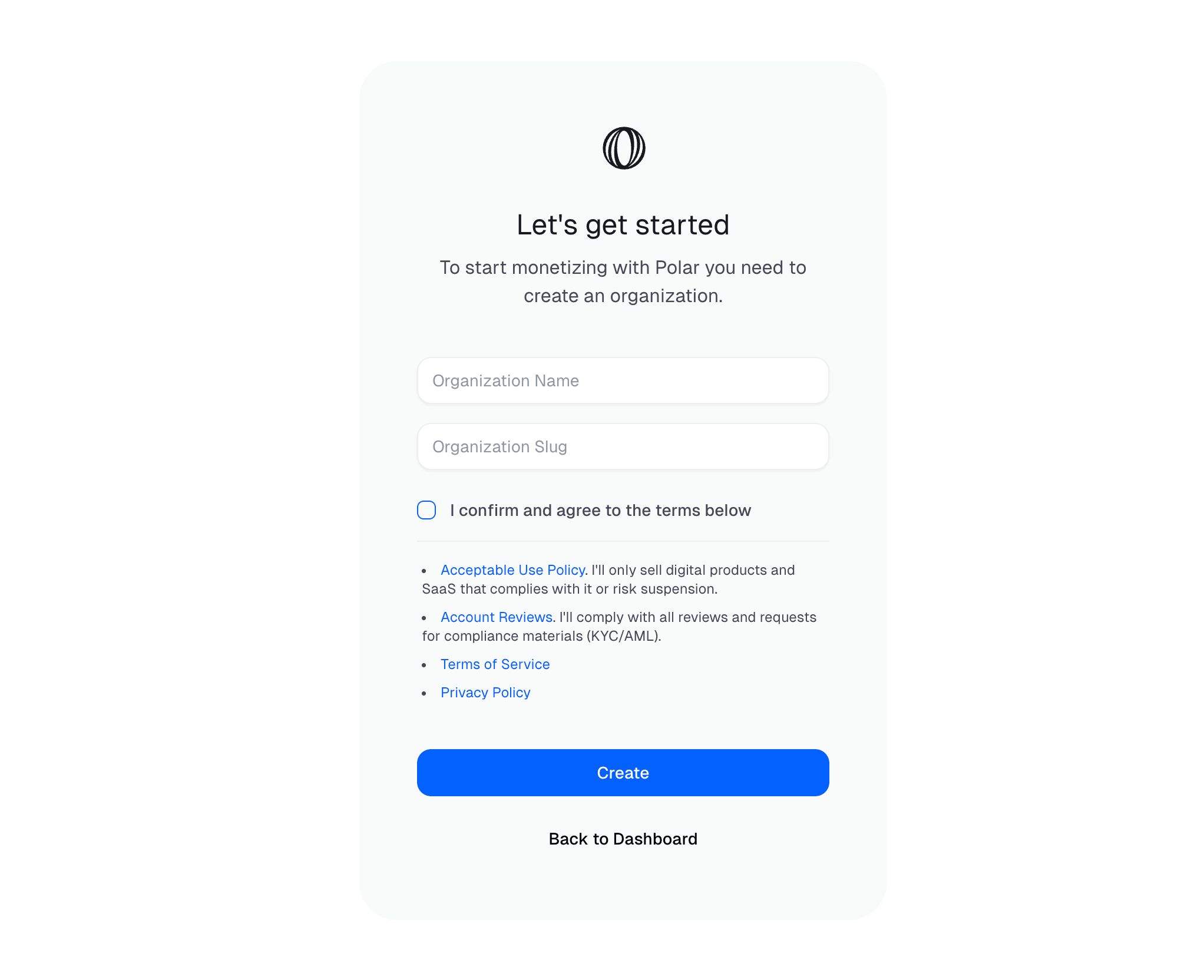 Sign up for Polar using GitHub, Google, or email. Create an organization to manage your products and customers.